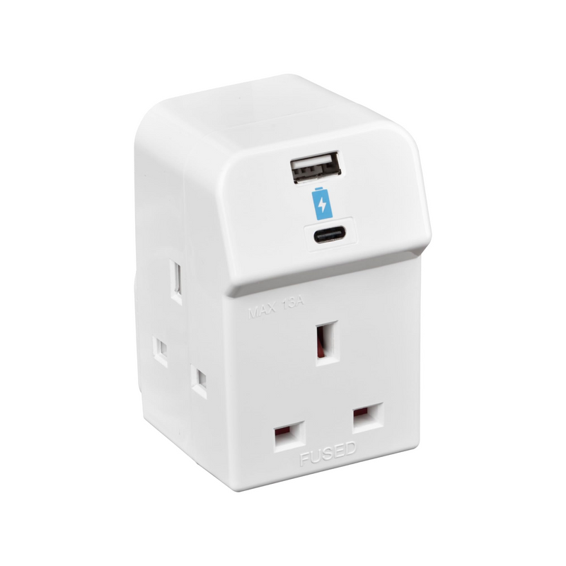 Masterplug 3-Socket Fused Wall Plug Adaptor + USB A & C Ports, White, 13A 10.5W ‒ A3UAC10